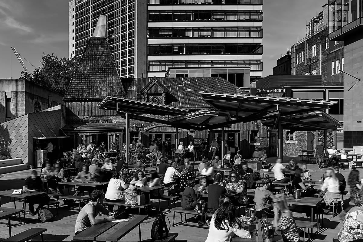 Allied London launched an invite-only architectural competition in the summer of 2016 to find a new design for the civic square with a brief to “create the best beer garden in the world”. Of the five architectural firms invited to enter, Arriola & Fiol won the competition with their design that focused on building a story around the historic Oast House as a point of departure, creating a beautiful transition to the modernity of the Spinningfields estate. Outdoor structures with roofs of differing materials and textures have been carefully positioned at different angles to create an increasingly contemporary design as the eye moves away from The Oast House towards Spinningfields.